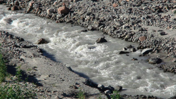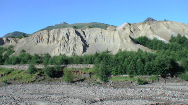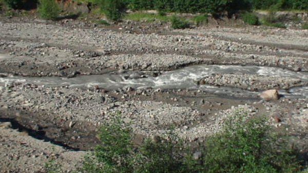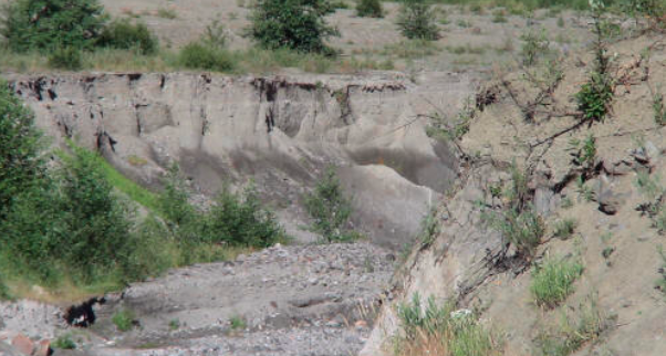 The Toutle doesn’t have a river bed, and changes course nearly every spring, leaving a wide swath of gravelly ground along its shores. In the spring, when the run off from the snow melt is at its peak, the river extends across the gray area.