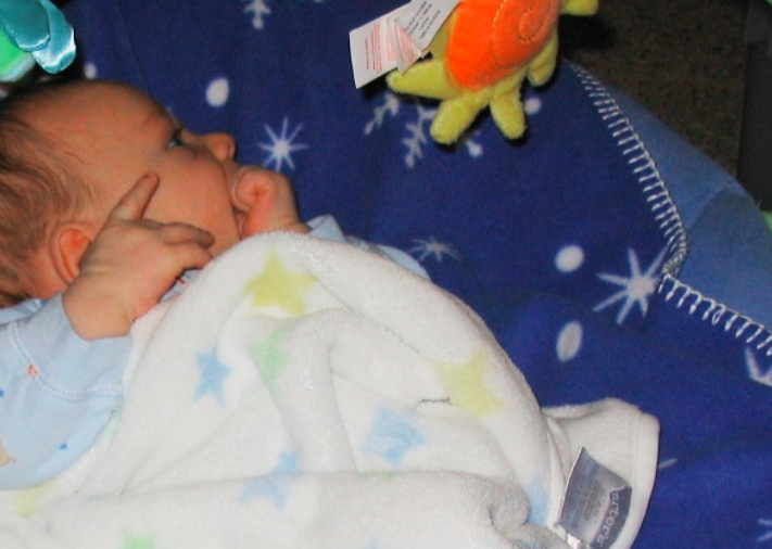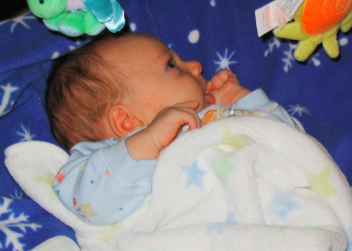He’s taking to sucking on his handnow and again… especially when we’re a bit slow on theconcept that he wants to eat… NOW. 🙂
