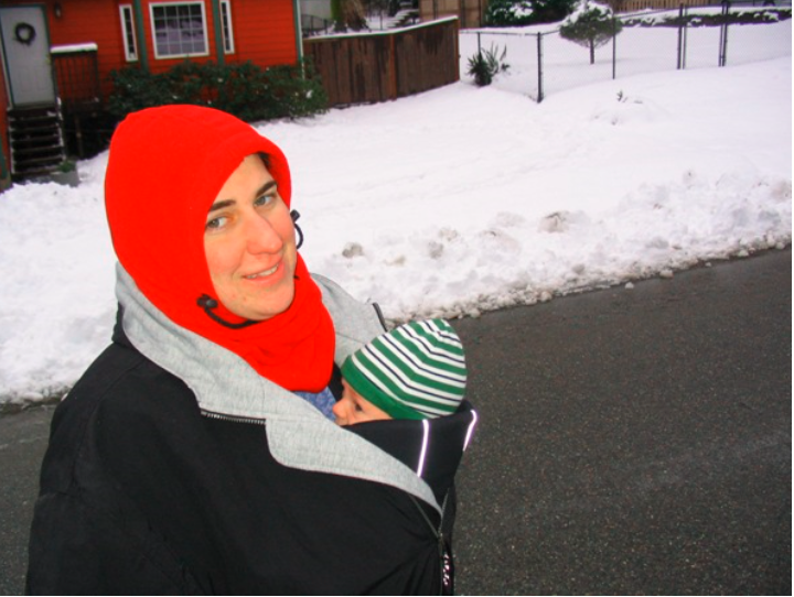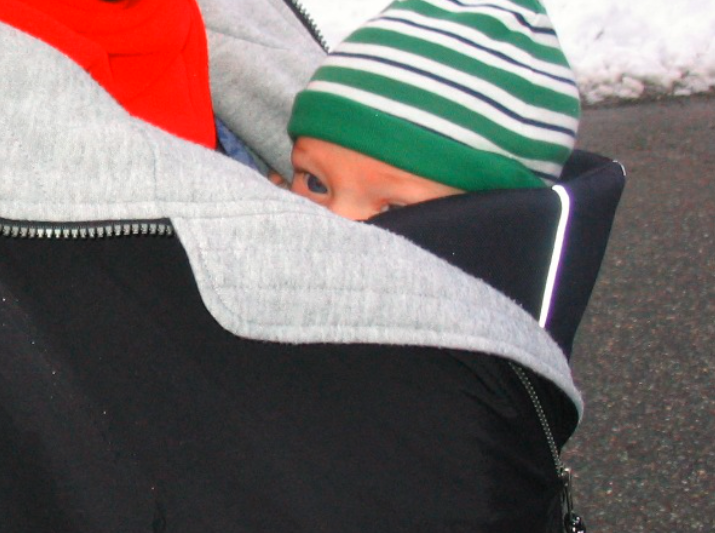 We went out for a walk in ourneighborhood… he doesn’t like it when its bright, but thecold doesn’t seem to bother him that much — we bundle himup quite a bit, and I guess it works. He sure likes looking around!