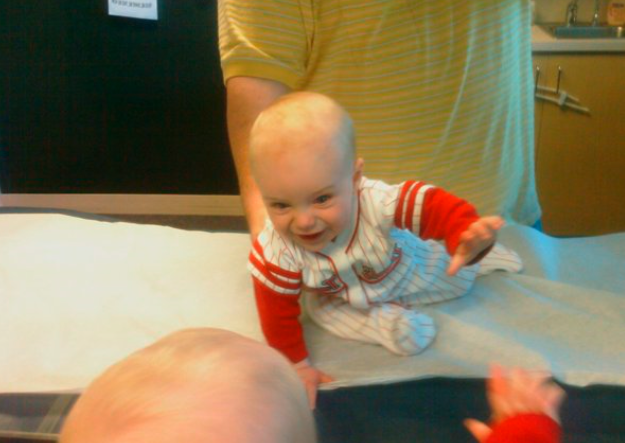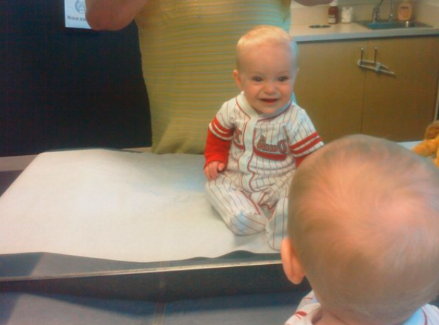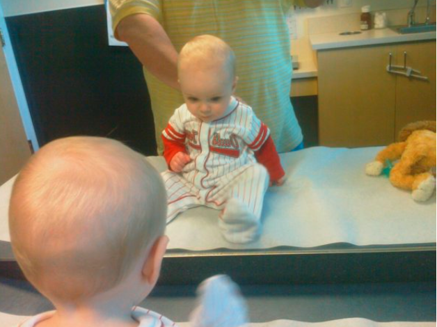 One of the things he likesthere is the big mirror they have on the wall… he reallyenjoyed checking out the ‘other baby’… not sure if he knowshe’s looking at himself yet.