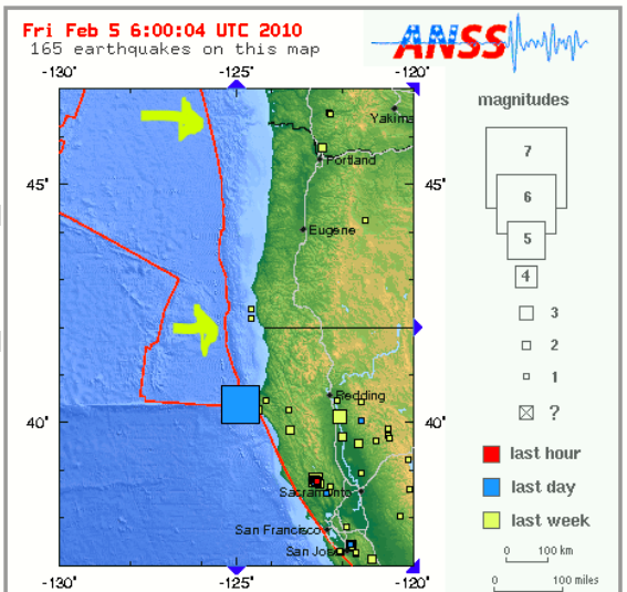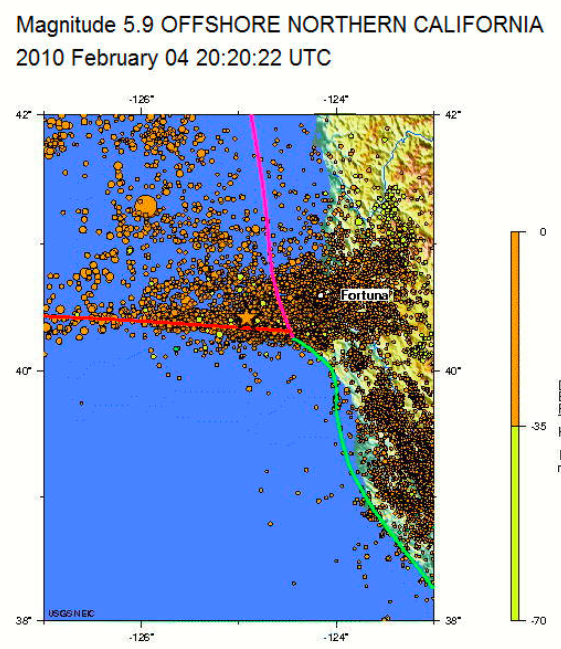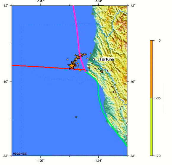 For the second time this month, a large quake happened at the southeastern corner of the Juan de Fuca plate, where the Mendicino Rift, the southern edge of the plate meets the rift that to the south forms the San Andreas Fault and to the north forms the Juan de Fuca Subduction Zone.