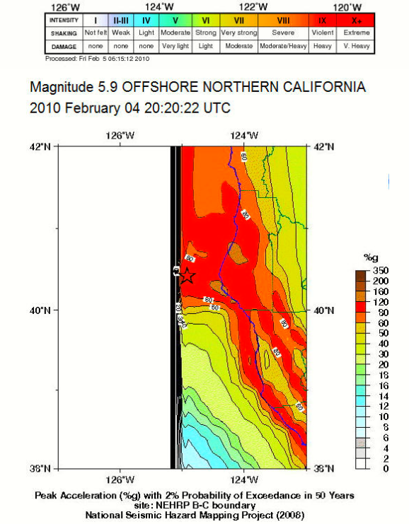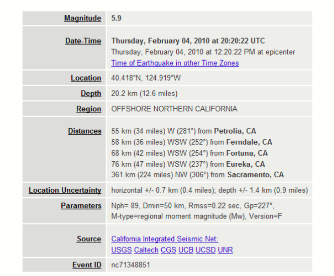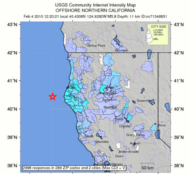 The U.S. Geological Survey reported the quake struck at 12:20 p.m. about 35 miles northwest of the community of Petrolia and nearly 50 miles west of Eureka. The shaking was felt within a 150-mile radius, as far north as southern Oregon and as far south as Sonoma County, according to the USGS Web site.