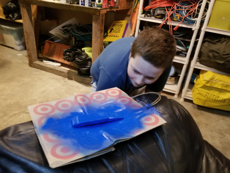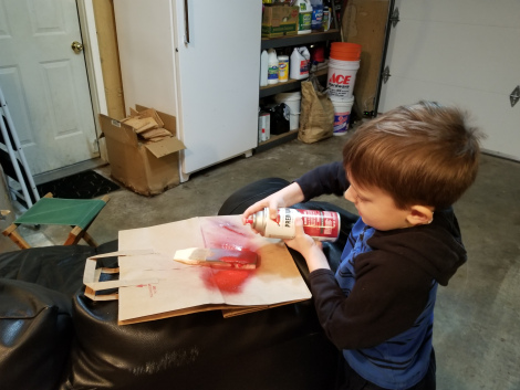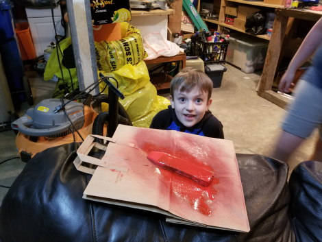 Both the boys wanted a wedge shape for their car, convined that would give them the edge in aerodynamics… so that’s what we did. They picked out the the colors, and did the painting.