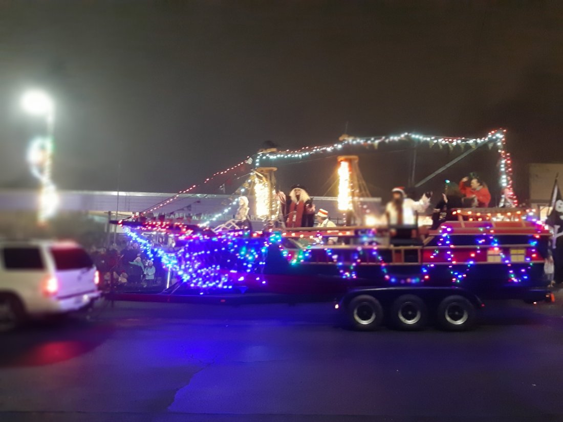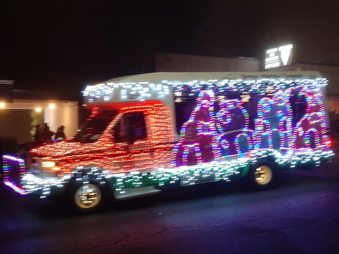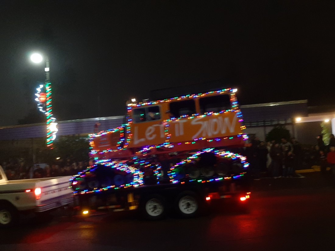 At about the middle of the parade the fog rolled in, adding a cool effect to the Christmas lights!