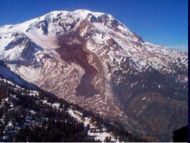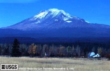 Mount Adams stands astride the Cascade Crest some 50 kilometers due east of Mount St. Helens. The towering stratovolcano (3,742 Meters – 12,276 Feet) is marked by a dozen glaciers, most of which are fed radially from its summit icecap. In the High Cascades, Mount Adams is second in eruptive volume only to Mount Shasta, and it far surpasses its loftier neighbor Mount Rainier (which is perched on a pedestal of Miocene granodiorite). Adams’s main cone exceeds 200 cubic kilometers, and at least half as much more was eroded during late Pleistocene time form earlier high-standing components of the compund edifice: peripheral basalt adds another 70 cubic kilometers or so.