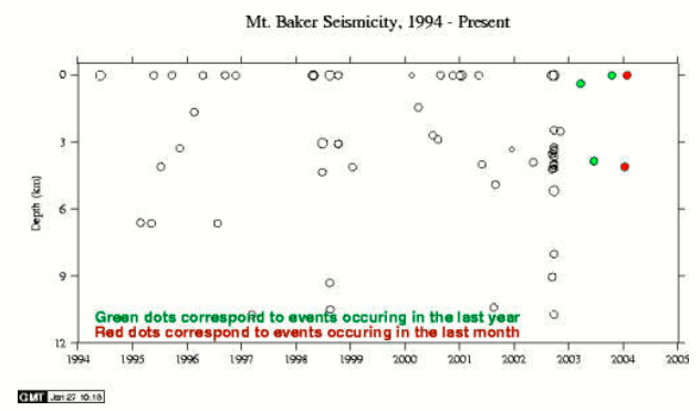 Historical activity at Mount Baker includes several explosions during the mid-19th century, which were witnessed from the Bellingham area, and since the late 1950s, numerous small- volume debris avalanches. In 1975, increased fumarolic activity in the Sherman Crater area caused concern that an eruption might be imminent. Additional monitoring equipment was installed and several geophysical surveys were conducted to try to detect the movement of magma. The level of Baker Lake was lowered and people were restricted from the area due to concerns that an eruption- induced debris avalanche or debris flow might enter Baker Lake and displace enough water to either cause a wave to overtop the Upper Baker Dam or cause complete failure of the dam. However, few anomalies other than the increased heat flow were recorded during the geophysical surveys nor were any other precursory activities observed to indicate that magma was moving up into the volcano. An increased level of fumarolic activity has continued at Mount Baker from 1975 to the present, but there are no other changes that suggest that magma movement is involved.