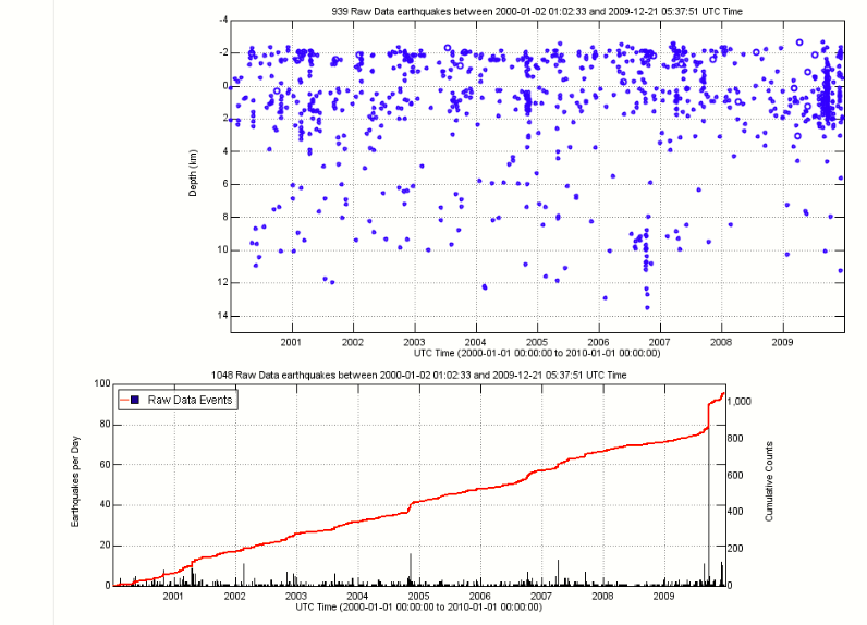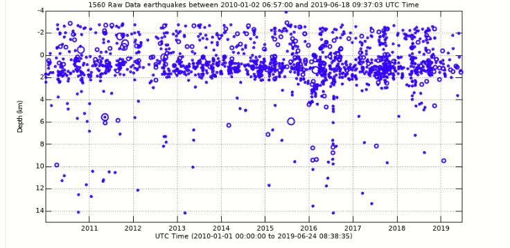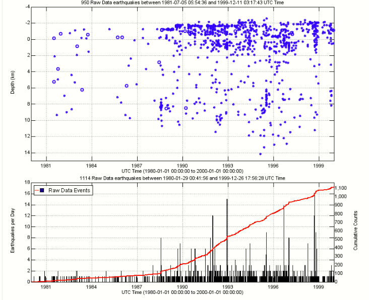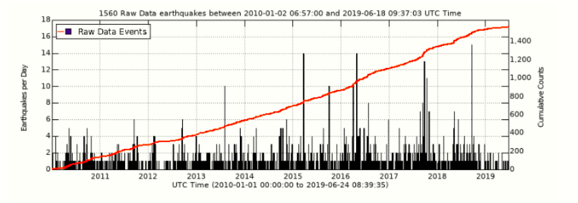 Here is a seismicity plot that shows the number of located earthquakes per day (black spikes) and the cumulative number of earthquakes over time (red). This can point out periods when more earthquakes were located such as a few days period in the spring of 2015 and summer of 2016 as oppossed to the very quiet period during spring and summer of 2012.